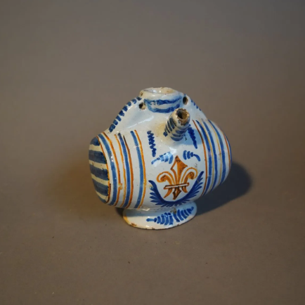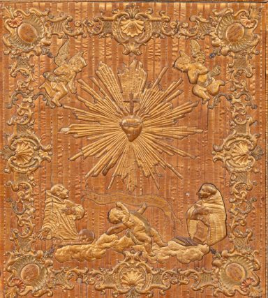 Ornée d'une importante sculpture naïve en taille d'épargne, dans une réserve centrale lenticulaire, représentant un couple de bergers dans un champs fleuri. Superbe travail de sculpture, d'une belle naïveté et avec une foisonnement de détails.